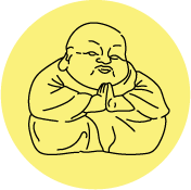 Yellow line drawing of a smiling Buddha with hands in prayer position on a black background, with the text 'Fat Buddha Thai Long Crendon' underneath.